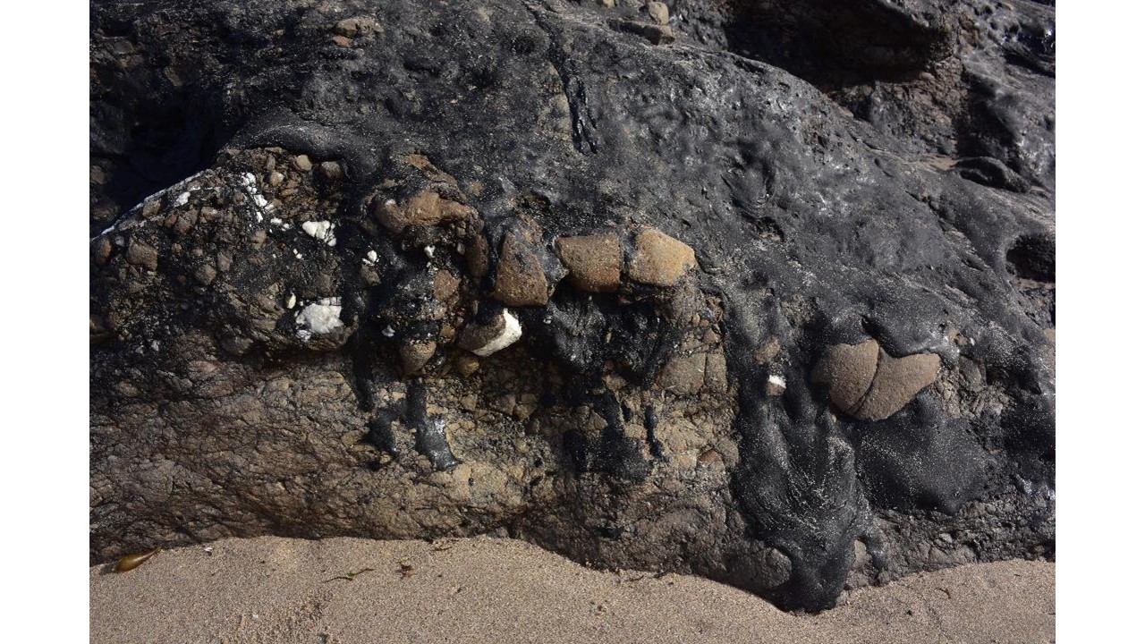 Cobbles in tar, with tar splattered on them. If you didn't know it was natural, you'd be really angry that someone dumped this tar out here at the beach.